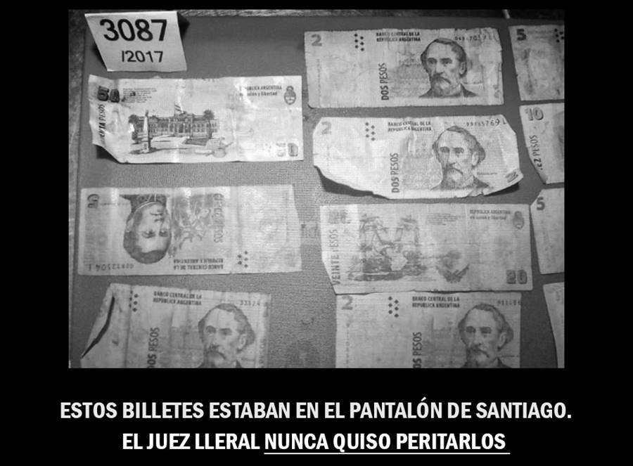 Estos billetes que se ven en la imagen, se encontraban en el pantalón de Santiago el día que encontraron su cuerpo el 17 de octubre de 2017. Se aprecia que estos se encontraban en perfecto estado. La familia solicitó el peritaje de los mismos, pero el juez Lleral denegó el pedido.