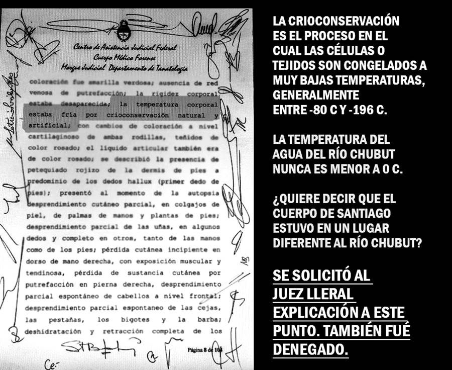 Adjuntamos también el texto de los resultados de la autopsia que dice: “La temperatura corporal estaba fría debido a la crioconservación natural y artificial”. La crioconservación es el proceso en el cual las células o tejidos son congelados a muy bajas temperaturas, generalmente entre -80 ºC y -196 ºC. La temperatura del agua del Río Chubut nunca es menor a 0 ºC. ¿Quiere decir que estuvo en un lugar diferente al Río Chubut? Se solicitó al juez Lleral explicación a este punto, siendo también denegado.